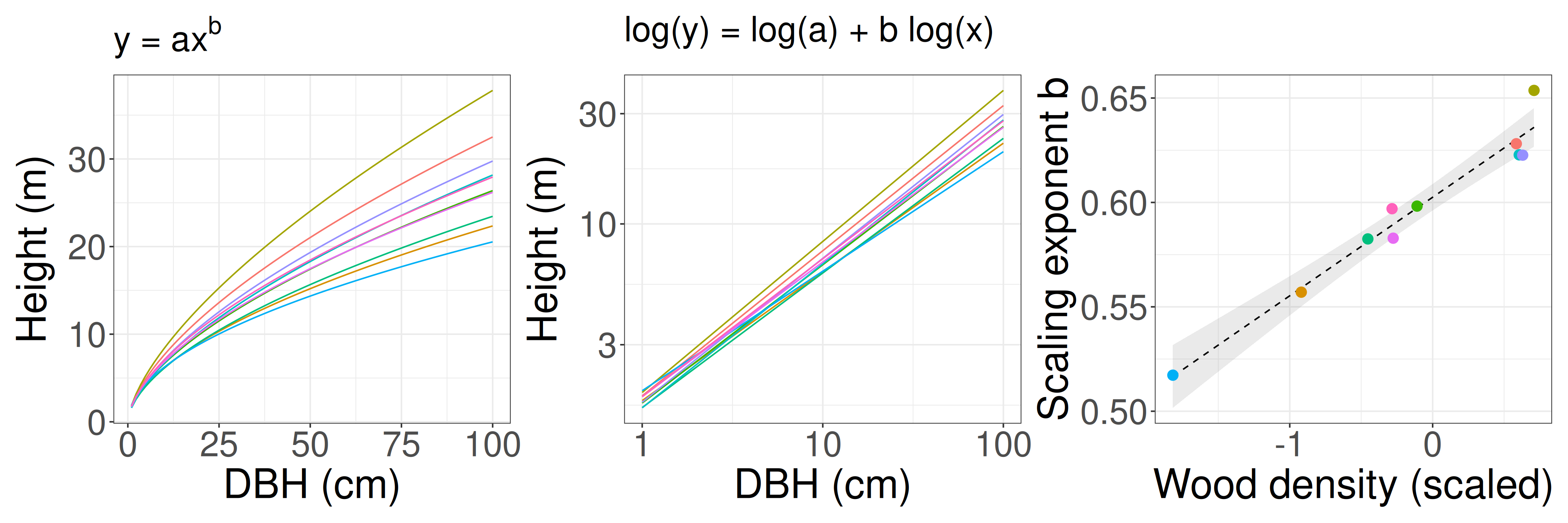 There is a power-law relationship (\(y =ax^b\)) between tree diameter (DBH) and tree maximum height, and the power-law exponent varies among species. Those relationships depend on wood density.