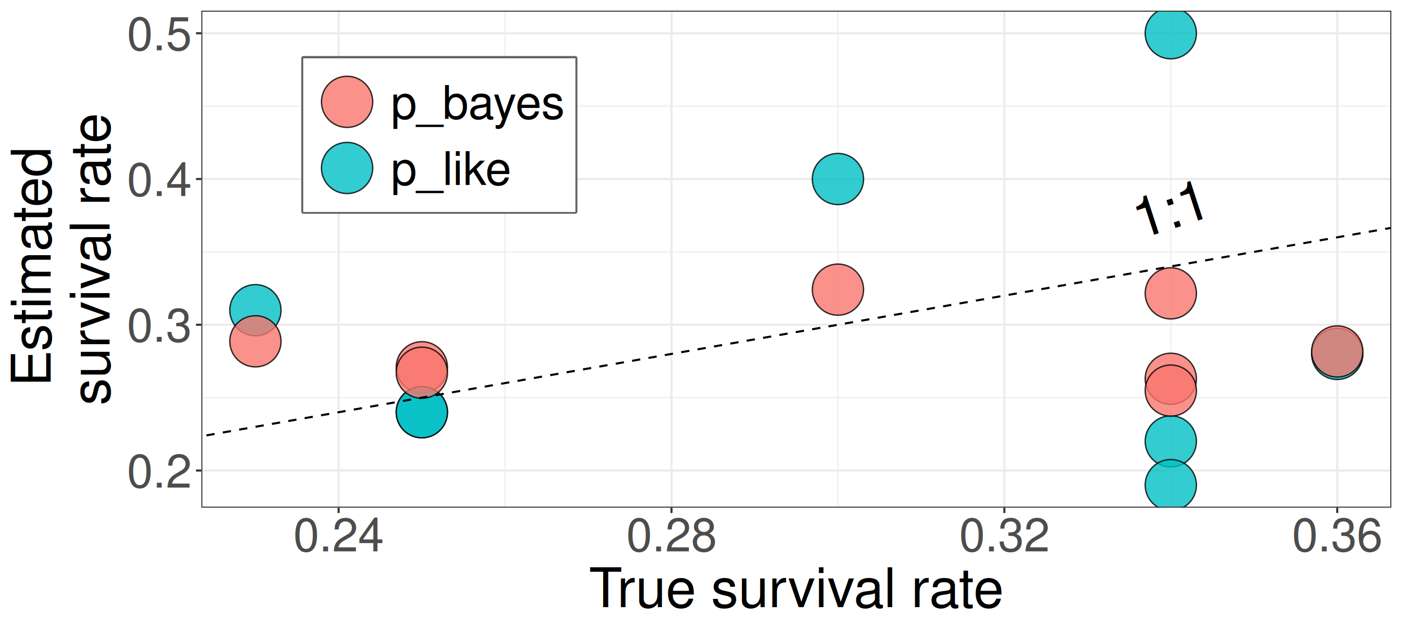 Closed symbols (p_bayes) align more closely with the 1:1 line, indicating more accurate estimates.