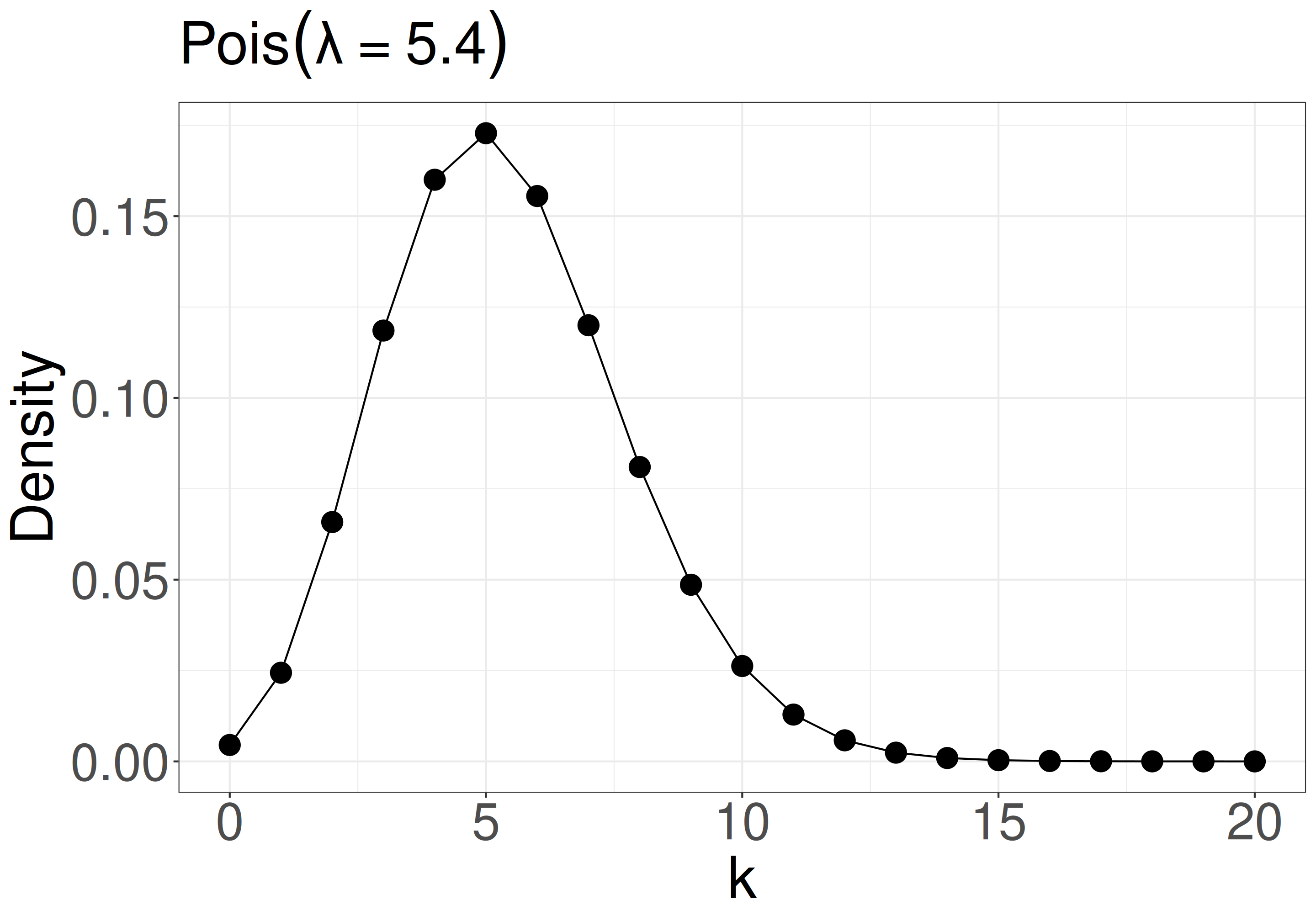 e.g., when your model is \(k_i \sim \mathcal{Pois}(\lambda = 5.4)\) (Poisson distribution with mean and variance = 5.4), what is the probability mass at k = 8?