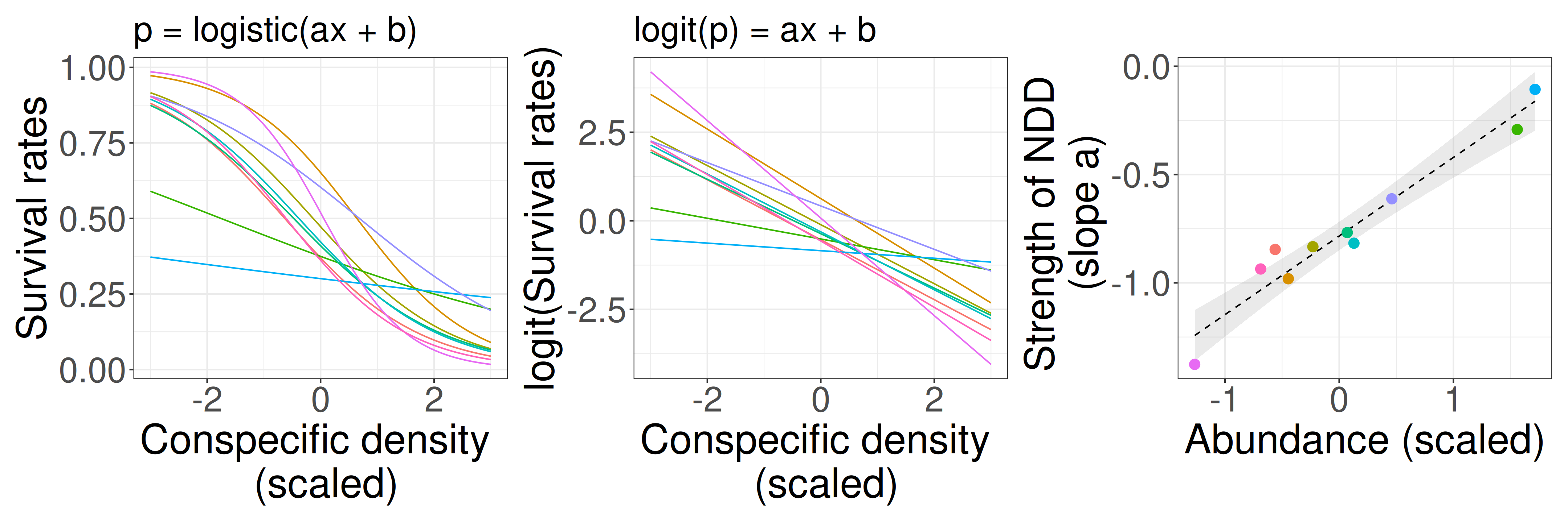 There is negative density dependence (NDD) of seedling survival rate, and the strength of NDD varies among species. The strength of NDD depends on species abundance.