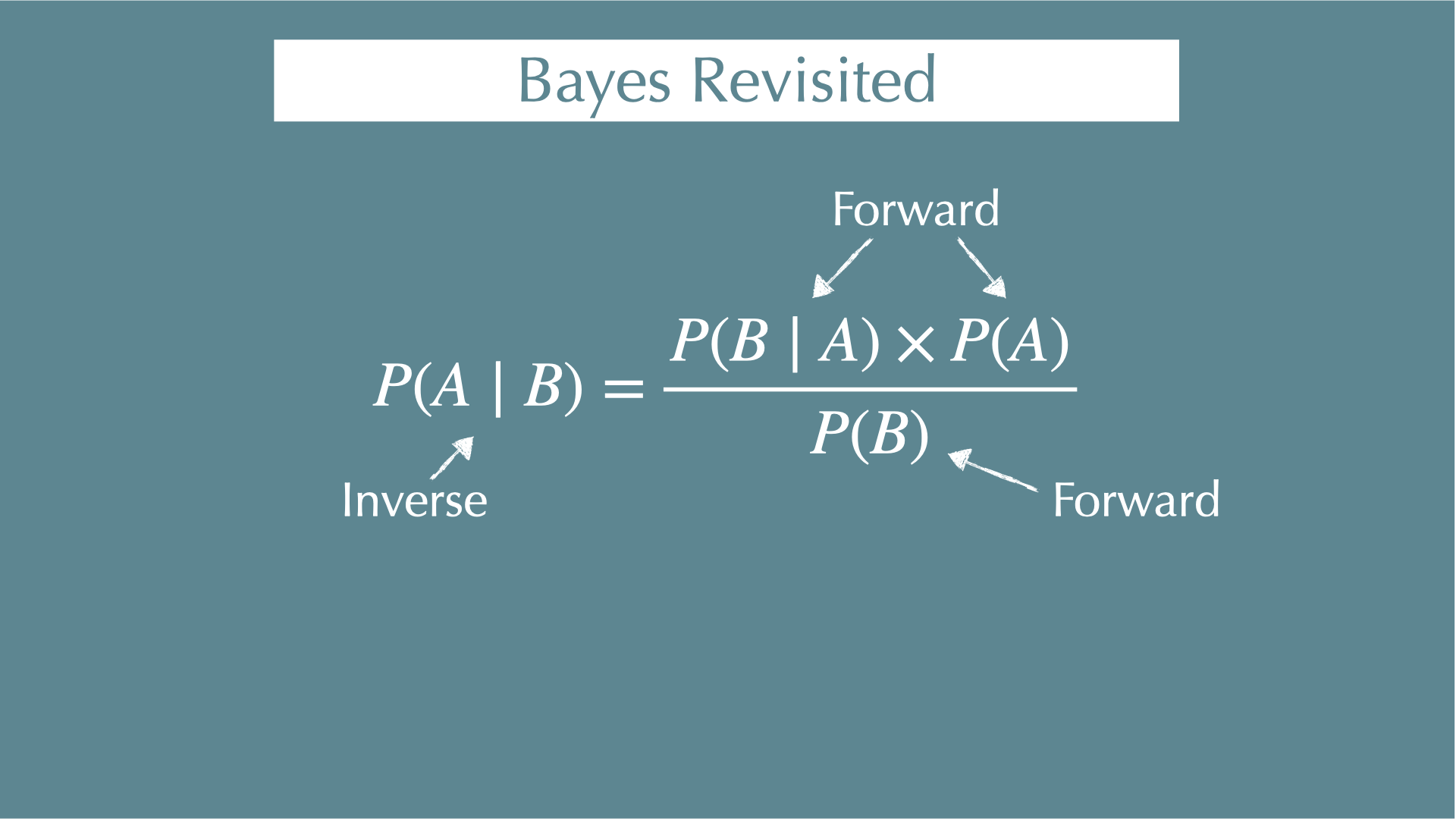 \[ P(A \mid B) = \frac{P(B \mid A) \times P(A)}{P(B)} \]