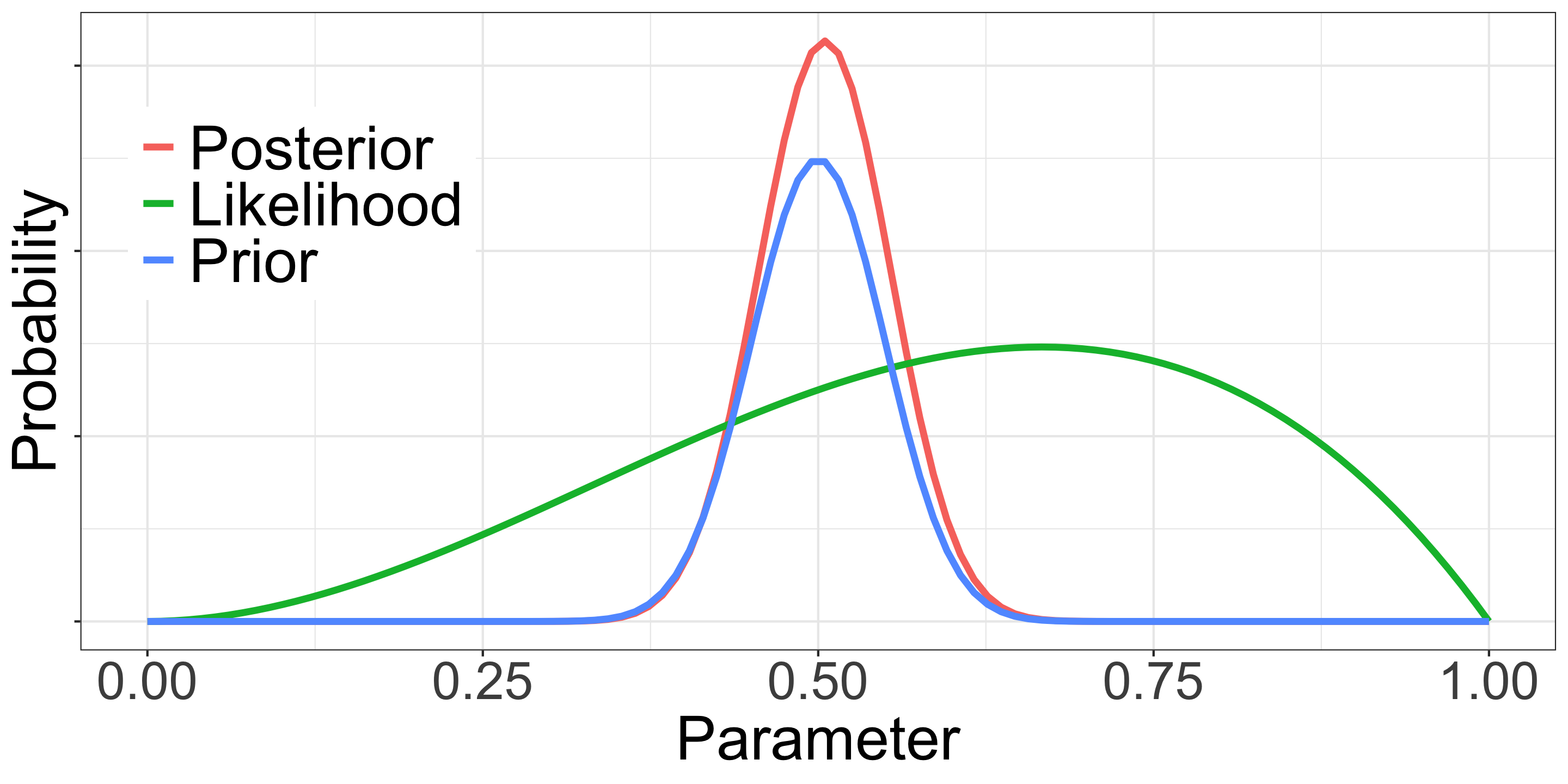 \[ P(\mathrm{Parameter} \mid \mathrm{Data}) = \frac{P(\mathrm{Data} \mid \mathrm{Parameter}) \times P(\mathrm{Parameter})}{P(\mathrm{Data})} \]