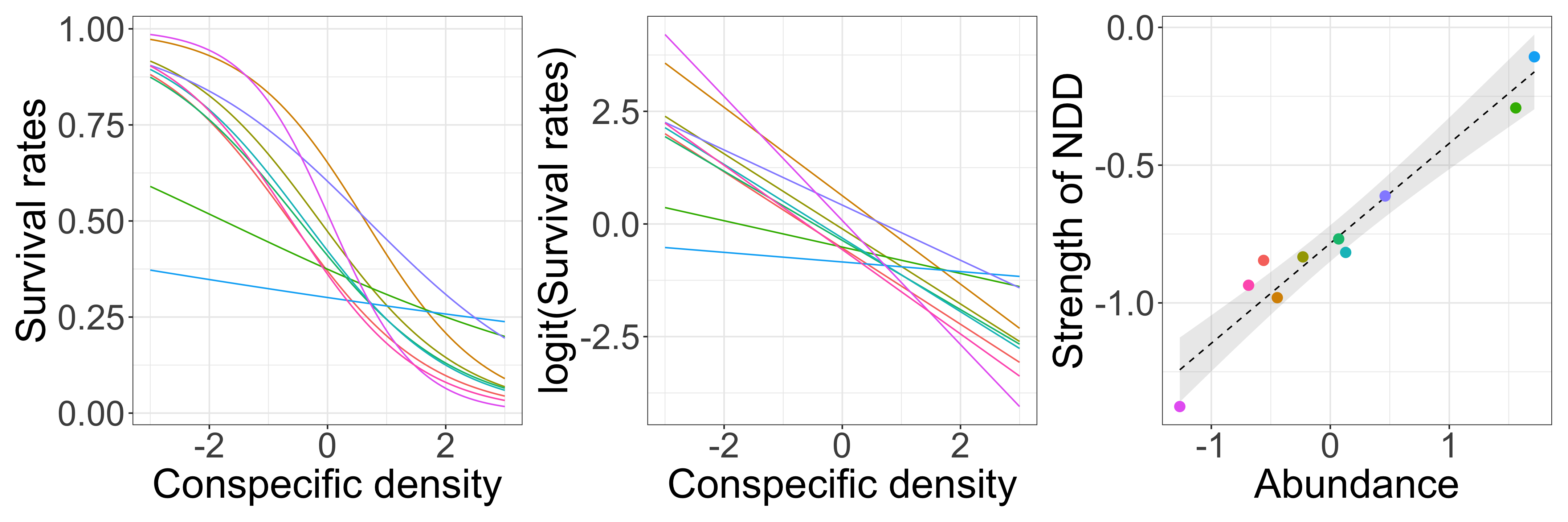 There is negative density dependence (NDD) of seedling survival rate, and the strength of NDD varies among species. The strength of NDD depends on species abundance.