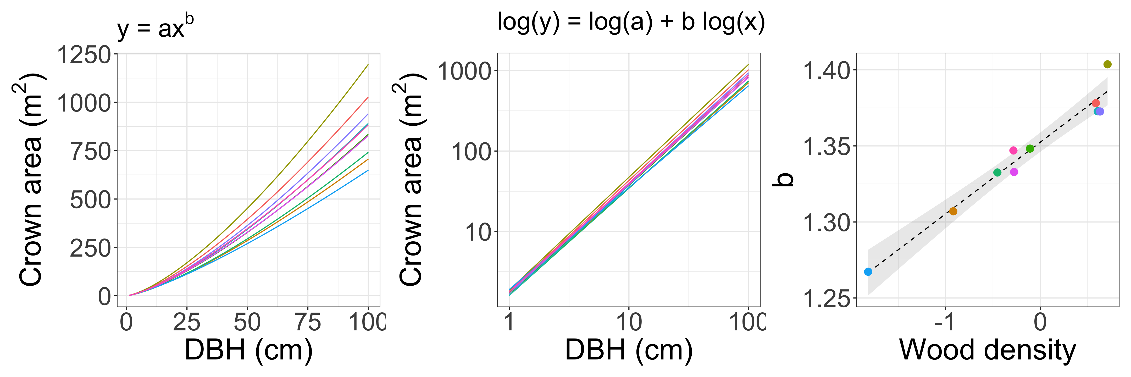 There is a power-law relationship (\(y = ax^b\)) between tree diameter (DBH) and crown area, and the power-law exponent varies among species. Those relationships depend on wood density.