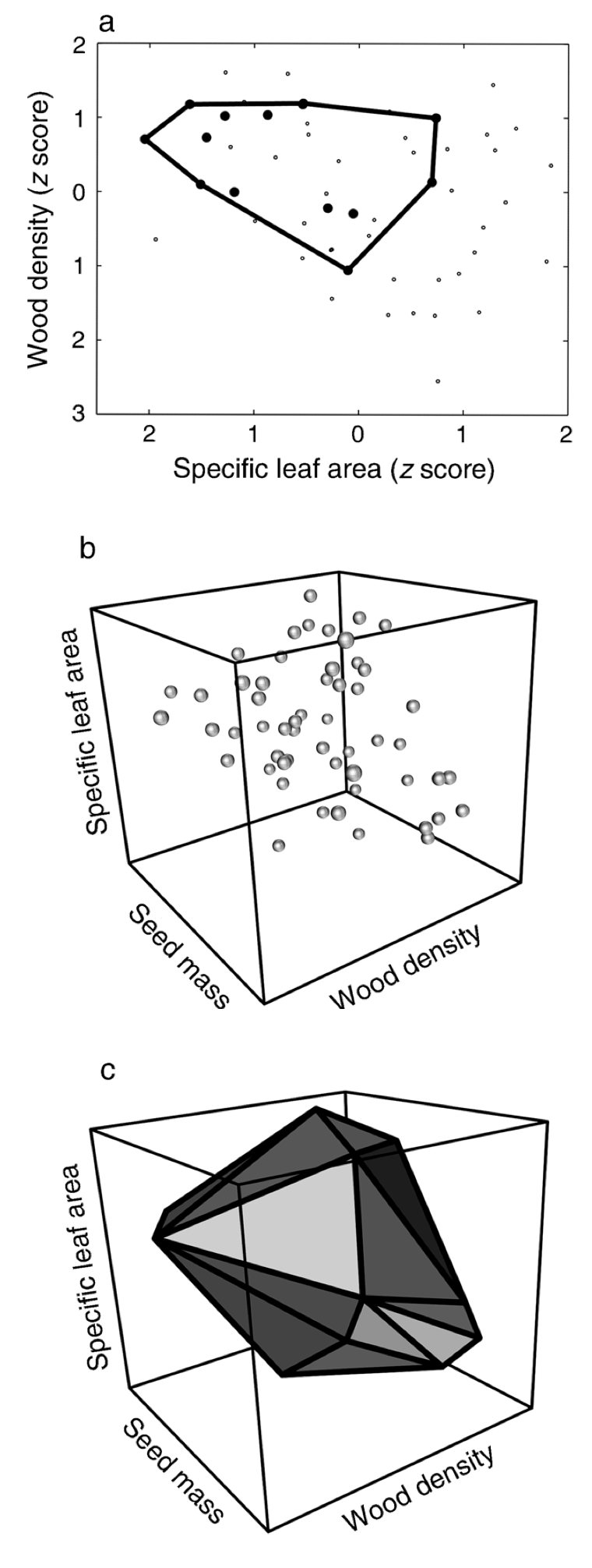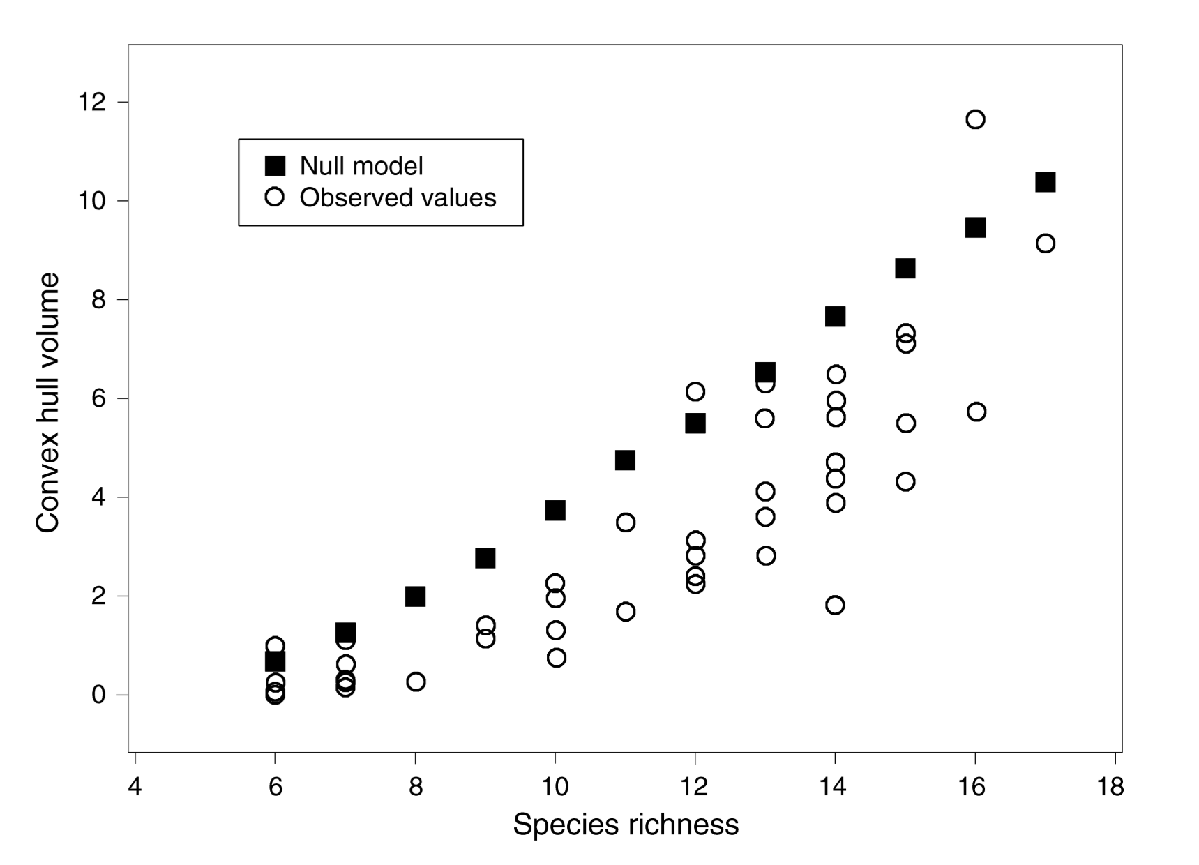 [1] Cornwell, W. K., Schwilk, L. D. W. & Ackerly, D. D. A trait-based test for habitat filtering: convex hull volume. Ecology 87, 1465–71 (2006).