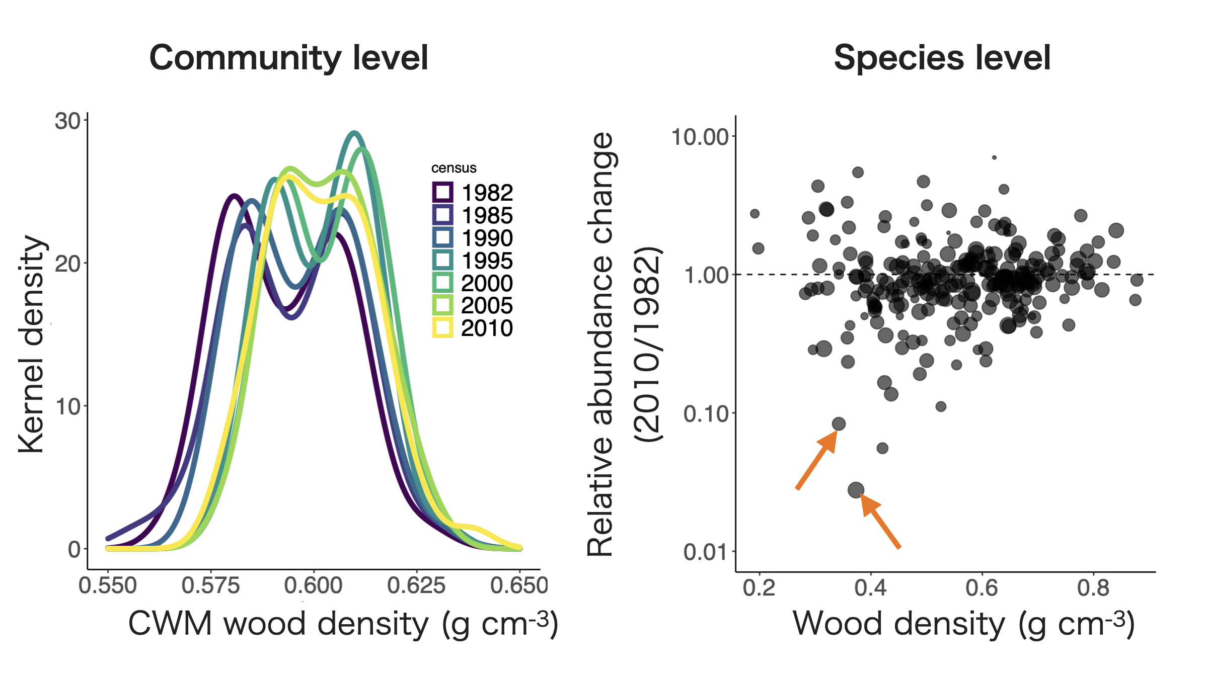 The changes in community-weighted mean (CWM) of wood density over time seem to suggest a community-level response in climate change (i.e, drier conditions).